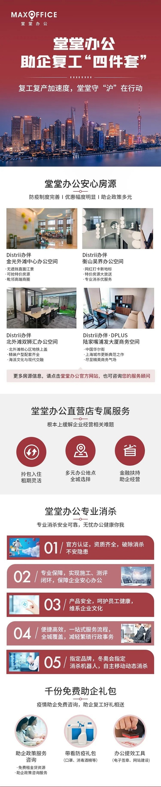 为了有效降低疫情造成的影响,在上海疫情初步稳定之时,MaxOffice堂堂办公就推出了助企复工“四件套”——安心房源/国企房源、直营店专属服务、专业消杀服务、千份助企礼包。