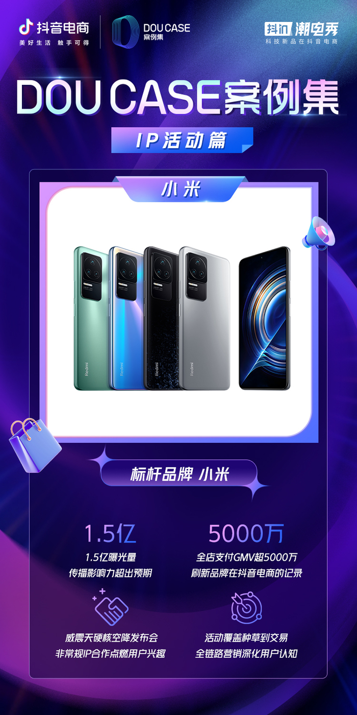 早在2019年,小米就开始了和抖音电商合作。今年3月底,小米旗下Redmi K50系列3月底在抖音电商首发,与全新IP——抖in潮电秀的深度合作,创造了1.5亿曝光量,传播影响力超出预期;全店支付GMV超过5000万,刷新了品牌在抖音电商的记录。