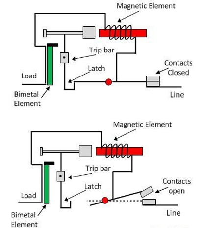 双金属片的这种偏转释放了机械闩锁。 由于该机械闩锁连接到操作机构,因此会打开微型断路器触点。