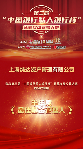 近日,由中国银行私人银行主办,中银证券、朝阳永续承办的第三届“中国银行私人银行杯”私募实盘交易大赛“半年度最佳基金管理人”榜单揭晓。上海纯达资产管理有限公司(纯达基金)凭借产品表现荣获“半年度最佳基金管理人”奖项。