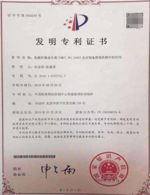 并且高原植物乳杆菌HT121已在天津市第三中心医院完成人体临床降脂实验,受试者食用含有HT121的食品后参与随机双盲、安慰剂对照的临床试验,进行长达12周的科学观测。结果显示HT121可使低密度脂蛋白胆固醇恢复到正常水平,同时能有效降低低密度脂蛋白胆固醇和总胆固醇,没有任何过敏反应和不良事件发生。目前已获得国家降脂专利(在制备降脂药物中的应用,专利号ZL 2016 1 0757751.7)这为进一步推进植物乳杆菌HT121降血脂的研究奠定良好基础,也为降脂减肥提供更多干预治疗办法。