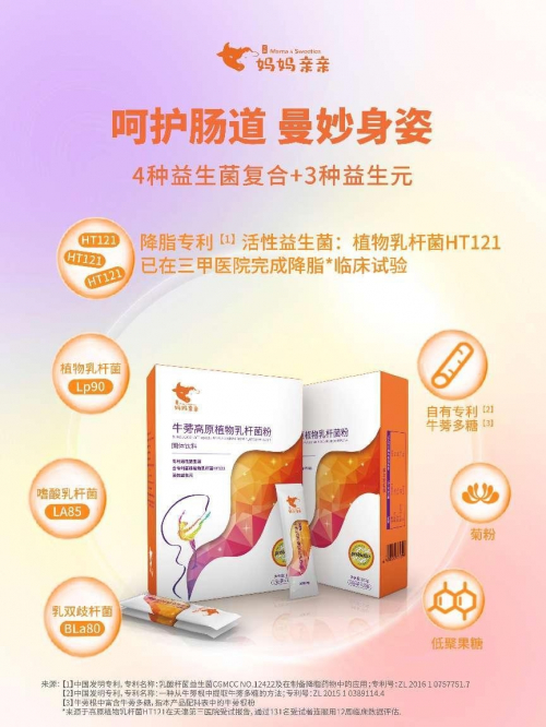 经过博德生物集团的不懈努力,成功研发含有高原植物乳杆菌HT121的功能食品——牛蒡高原植物乳杆菌粉。产品特别采用“双益”配方,除高原植物乳杆菌HT121之外,同时添加植物乳杆菌Lp90、嗜酸乳杆菌LA85以及乳双歧杆菌BLa80,复配三种益生元:菊粉、低聚果糖及博德生物集团专利成分牛蒡多糖,科学配比双益复配,协同发挥出高原植物乳杆菌HT121的最大作用。