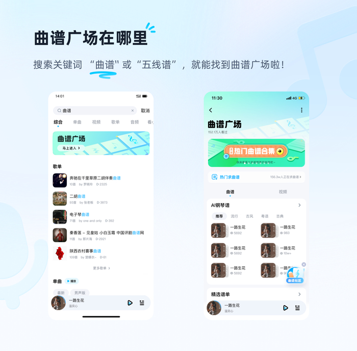 酷狗智能曲谱,只是酷狗“曲谱广场”专区中的一部分内容,酷狗更多曲谱来自于用户们的自发分享。因此,酷狗在2021年10月推出了“一键求谱”和“上传曲谱”功能,乐迷们可以在“曲谱广场”内获得优质的精选曲谱,也可以自主上传曲谱与他人分享。自酷狗“曲谱广场”专区上线以来已经有超过百万乐迷加入到其中。