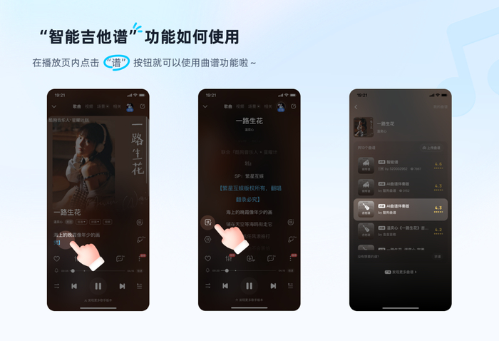 酷狗曲谱功能将AI技术引入到曲谱中,打造了“智能吉他谱”“智能钢琴谱”,解决了以往乐迷们难以找到满意谱曲的烦恼,让大海捞针般在各类问答平台或社群论坛进行提问却无人回应,或是在网购平台购买价格不菲但质量参差不齐的情况不再出现。