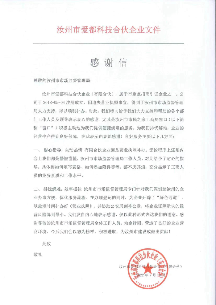 据了解,汝州爱都科技有限合伙控股的爱都科技,是一家年营业额超过10亿规模的科技企业,拥有1300多名员工,是国内智能可穿戴领域ODM的龙头企业,属于汝州市重点招商引资企业之一。2022年6月底,因遗失营业执照事宜,前往汝州市市民之家办理营业执照和公章遗失补办手续。了解到企业的急需后,考虑到企业的情况特殊,汝州市市场监督管理局工作人员立即为企业开辟“绿色通道”,积极指导企业准备好登记所需的各项资料,快速办理了相关业务,使其在最短的时间内完成了登记注册。