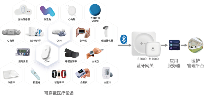 蓝牙物联网动态血糖CGM监测在智慧病房的成功应用,带动了其它蓝牙可穿戴医疗体征监测设备纷纷加入蓝牙物联网的行列。如便携式血压计、可穿戴式血氧仪、心电贴、胰岛素泵、心率仪、雾化器、肠音贴、生物传感器、连续听诊记录仪等等。常规生命体征监测均可通过“可穿戴医疗设备+物联网”的方式实现实时、连续监测,全面快速准确地捕捉患者生命体征,让医生护士在不接触患者和操作设备的情况下,精准监测患者身体状态,帮助医护人员第一时间发现患者的病情变化,实现生命体征异常风险预警,也为医生诊治患者提供科学的数据支撑,极大地减轻了医护工作者的工作强度,提高了工作效率。