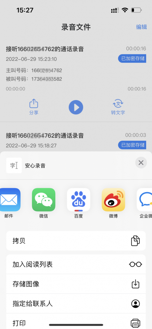 生成的通话录音文件可以分享到QQ、微信等社交平台,也可以通过邮件分享。