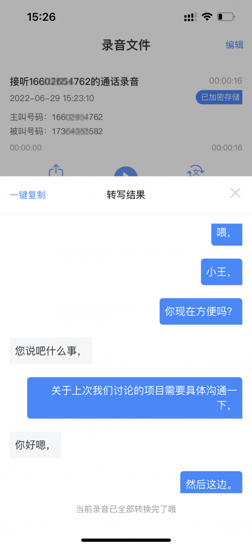 这款APP比较智能化的地方还有,通话录音转成文本的时候可以以对话的形式场景化展示,这一个功能对商务人士非常友好,方便我们梳理工作会议重点。