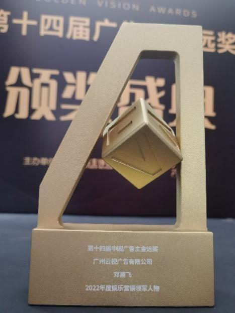 “新局势,新营销”,第十四届广告主金远奖人物类奖项获奖名单新鲜出炉,云视广告创始人兼总裁——邓建飞先生,荣获“2022娱乐营销领军人物”大奖。