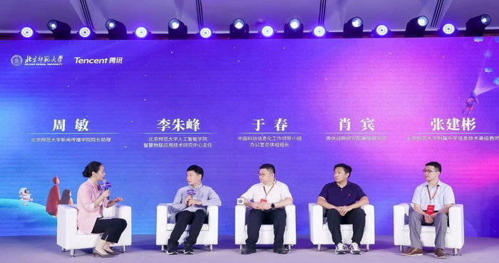 随后,大会进行了两场圆桌研讨,第一场圆桌会谈对话主题为“创新——青少年数字能力提升的路径探索”,北京师范大学新闻传播学院周敏教授主持。论坛嘉宾北京师范大学人工智能学院李朱峰表示,目前已经进入人工智能时代,生产工具和创新创作的方式都发生很大变化,人工智能素养和人工智能导向能力有助于青少年未来在人工智能设备中形成更好的创造和发明,需要结合人工智能技术和未来媒体技术,让人工智能教育落地,让青少年更便捷、更直接、更系统地接受人工智能教育和实践培养;中国科协信息化工作领导小组办公室总体组组长于春表示,科协在信息化方面努力贴近少年儿童,从培训体系、竞赛体系、公共科普体系加大资源投入,在信息化、数字化转型过程中,如何把科普、科创、智慧以及人才成长的体系和资源打通是重点;腾讯微信战略研究院高级研究员肖宾表示,腾讯公司坚持科技向善,也启动了绿苗计划、知识星光等一系列线上线下公益活动,也是希望在充满未知的互联网世界用善意给大家点亮星星之灯,为孩子们的健康成长尽互联网平台应尽的责任。