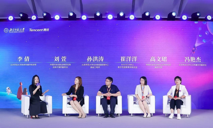 第二场圆桌对话主题为“共生——青少年网络素养生态体系构建”,北京师范大学新闻传播学院讲师李倩主持。中国科协创新战略研究院创新环境所副所长刘萱表示,科学文化素养提到的科学思想和科学精神是一种文化塑造,是激发民族和国家持久创新的内生动力,向善是我们美好的追求,是互联网治理的底层逻辑。北京师范大学孙洪涛希望孩子们可以更好地理解数据、甄别数据、应用数据,使其成为青少年理解智能时代的一把钥匙,在认识到数据价值的同时,也要认识到数据的边界所在;华为 TECH4ALL 数字包容教育领域总监崔洋洋表示,华为希望更好地发挥技术能力、让华为应用平台与教育层层结合,帮助每个学生都有机会接受优质的教育;中国社会科学院社会学研究所副研究员高文珺认为,如果互联网-家庭-学校可以系统性地发挥作用,可以大大减少青少年依赖网络满足需要的动机,将网络对青少年的影响引向更积极的方向;北京师范大学大兴附属中学副校长冯艳杰分享了青少年网络素养教育的实践,她表示,让网络素养通过学校课程渗入到学生的思维中去,可以预防青少年网络侵害,提升青少年网络技能、同时让青少年在互联网上自我发展,希望高校有更多前沿的项目可以渗透到基础教育中去,让青少年群体走在问题的前面。