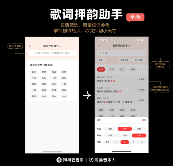 在谈及此功能上线的目的时,网易云音乐方面表示,在针对音乐人的调研中,发现不少音乐人在作词过程中面临比较大的困扰,一方面缺乏灵感来源,另一方面则常常遇到遣词造句的困难。面对这种情况,网易云音乐“灵感充电站2.0”歌词素材库汇总、提供了来自云村的热评金句及故事,让音乐人可以通过浏览自己感兴趣的热评来启发创作。此外,灵感充电站2.0”联合网易伏羲特别推出AI智能歌词押韵助手,根据意象、语义、词性,智能检索相近押韵词,并提供关联押韵词在优质歌曲中使用的歌词案例参考。对于缺乏作曲、编曲灵感的音乐人,还可以在“灵感充电站2.0”的热门伴奏曲库中试听和购买伴奏成品。