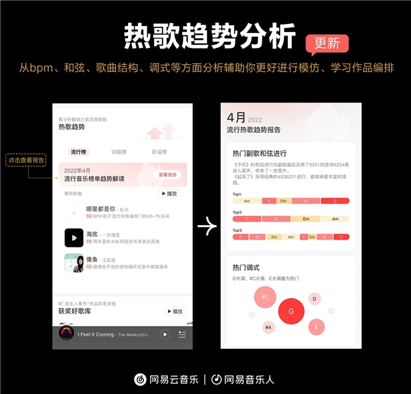 升级之后的灵感充电站,还为擅长不同风格的音乐人提供了更具有参考意义的优质内容。结合网易云音乐音视频实验室的智能流行趋势研判算法,灵感充电站可对流行、嘻哈、民谣等常见的6大曲风的热门歌曲进行多维度分析,帮助音乐人了解不同曲风的热歌在bpm、歌曲结构、调式、和弦等因素上的共通性,更好地进行借鉴学习和作品编排。