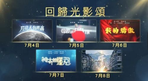 为祝贺香港回归25周年,TVB特别推出“香港回归25周年献礼”,当中包括戏剧及综艺节目。《回归光影颂》剧集系列一共有五个单元剧及一套十五集连续剧,并已于7月4日起,逢周一至周五晚上八点半TVB翡翠台与埋堆堆同步播出,此前播出的《究竟天有多高》《母亲的乒乓球》《我的骄傲》三部单元剧都获得不俗的收视和口碑。