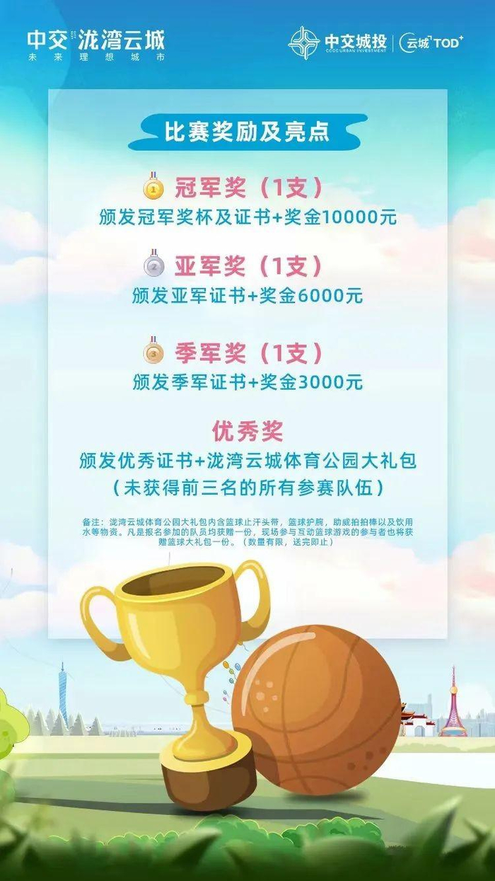凡是报名参赛的选手还将均可获得证书奖励和泷湾云城体育公园大礼包 一份,其中冠亚季军队伍还将额外获得现金奖励,最高可达1万元 !