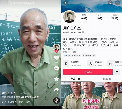 84岁的“深潜院士”汪品先,72岁的“科学姥姥”吴於人……在抖音上,像王广杰这样的高龄科普博主并不在少数。王广杰真正做到了老有所为、老有所乐,在退休后重新找到了属于自己的意义。而与他在直播间相遇的网友们,不仅学习到了电学知识,也同样被他的精神打动和激励。王广杰表示,只要“家人们”愿意听,就会一直做到老。“如果这些知识都烂在我的肚子里,我会感到很遗憾。”