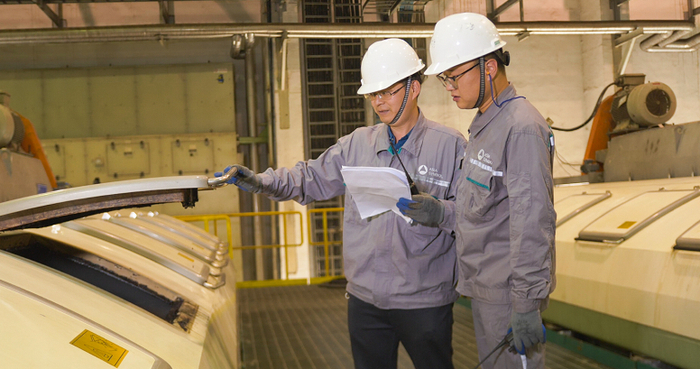 在蒸煮的过程中,会产生含有大量木质素的黑液,将在后续的工序中被全部收集,经过蒸发浓缩变成生物质燃料,送到回收率高达99.3%的碱回收炉中燃烧利用。燃烧产生的高压蒸汽带动汽轮发电机发电,平均每年发电量可达15亿千瓦时;发电后的低压蒸汽传送到车间的烘缸里,再用于浆板或纸张的干燥;黑液经过燃烧变成绿液,再经过苛化反应环节变成白液,重新回到蒸煮环节。