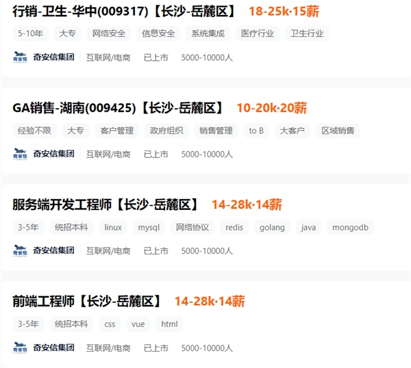 奇安信(688561.SH)成立于2014年,专注于网络空间安全市场。2019年,中国电子以37.31亿元战略入股奇安信,奇安信正式成为网络安全国家队。目前奇安信在终端安全、云安全、威胁情报、态势感知等领域的技术先进性及市场占有率排名持续领先。奇安信还多次参与国家重大活动网络安保工作,包括全国“两会”、70周年阅兵、一带一路峰会等。目前奇安信热招岗位包括开发工程师、销售等。