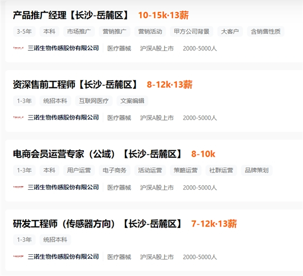 国内领先的血糖监测、血脂检测器械制造商三诺生物(300298.SZ)创立于2002年,致力于生物传感技术的创新,针对慢性疾病患者和医疗健康专业人员研发、生产和销售一系列快速诊断检测产品,曾收购Trivedi和PTS等国际领先的血糖监测企业。目前三诺生物热招的岗位包括产品推广经理、研发工程师、电商会员运营专家等。