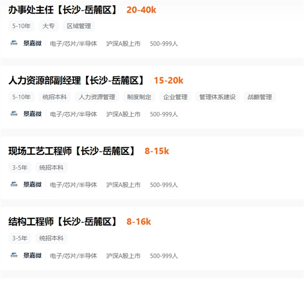 GPU龙头景嘉微电子(300474.SZ)成立于2006年,致力于信息探测、处理与传递领域的技术和综合应用,2016年在深交创业板成功上市,产品涵盖集成电路设计、图形图像处理、计算与存储产品、小型雷达系统、无线通信系统、电磁频谱应用系统等方向,广泛应用于有高可靠性要求的航空、航天、航海、车载等专业领域。目前热招人才包括结构工程师、现场工艺工程师等。