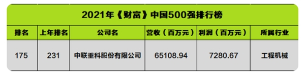 ▲ 财富中文网发布的2021年度《财富》中国500强企业排行榜中,中联重科再度上榜,位列第175位,较2020年跃升56名。