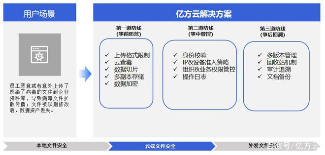 为了防御这些风险,360亿方云通过事前防范、事中管控、事后追溯三道防线,杜绝企业资料库感染病毒、防止数据丢失。