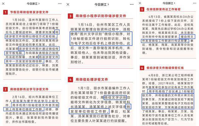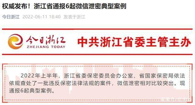 就在前几天,浙江省通报了6起2022年上半年发生的微信泄密的典型案例,主体涉及政务机关单位、银行、高校、企业等,多名当事公职人员因违规使用微信传输、处理涉密办公文件而受到批评、处分,引发多方关注。