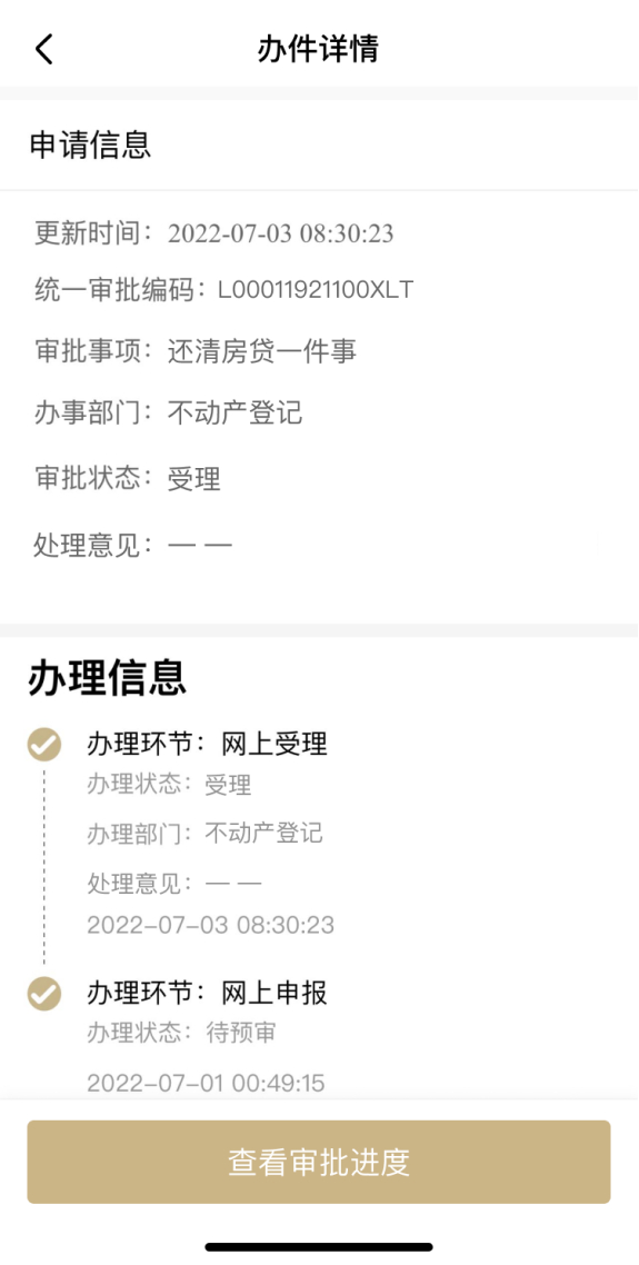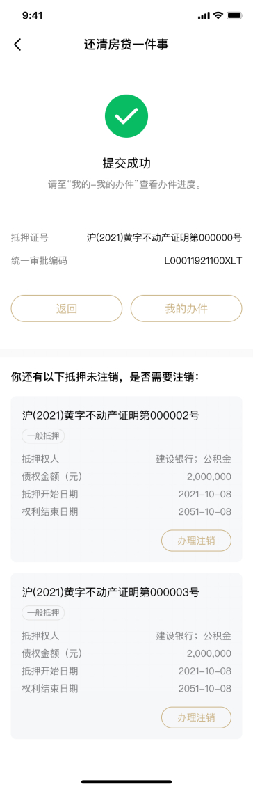 涉及公积金贷款的,会对当前抵押贷款公积金还清状态进行校验,当前状态已还清的,在确认公积金信息后,点击【确认提交】即完成申请操作。可点击【我的办件】查看办件进度。