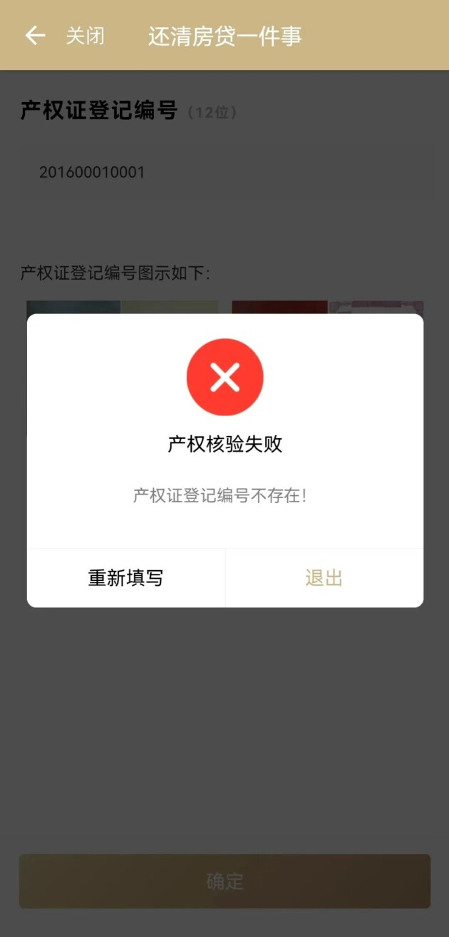 当录入产权信息有误,产权人不匹配,或该产权存在多房屋部位、查封限制等情况时,提示校验失败,需重新录入产权证登记编号或退出操作。