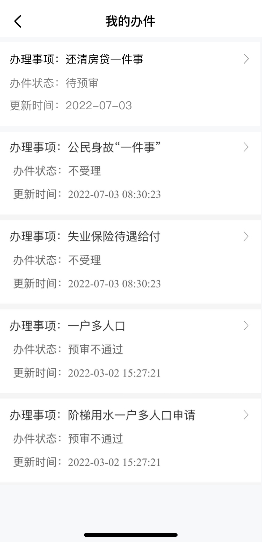 点击【办理事项】进入办件详情页,可查询不同单事项的办件进度。