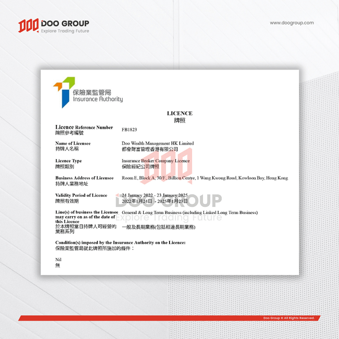 根据持牌保险经纪公司的规定,Doo Wealth 都会财富管理香港有限公司获授权在香港经营一般及长期业务(包括关联长期业务)。