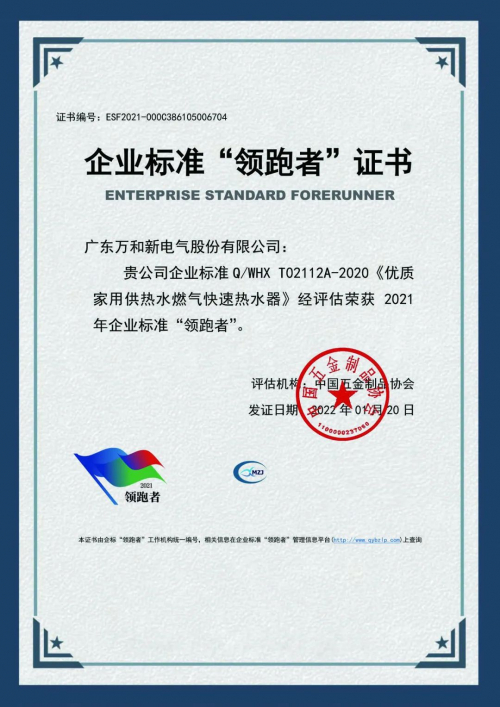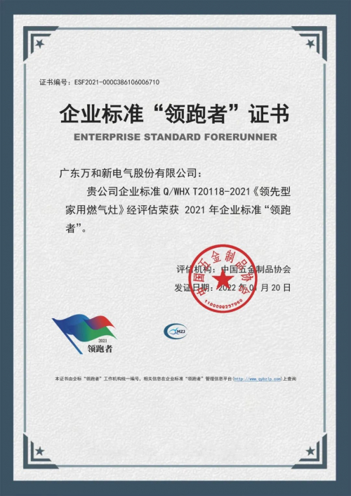 最近,中国标准化研究院联合中国标准化协会正式发布了2021年企业标准“领跑者”入围名单,广东万和新电气股份有限公司企业标准Q/WHXT0211A-2020《优质家用快速供热水燃气快速热水器》和Q/WHX T20118-2021《领先型家用燃气灶》这两项标准经评估入围2021年企业标准“领跑者”,并由中国五金制品协会颁发了企业标准“领跑者”证书。