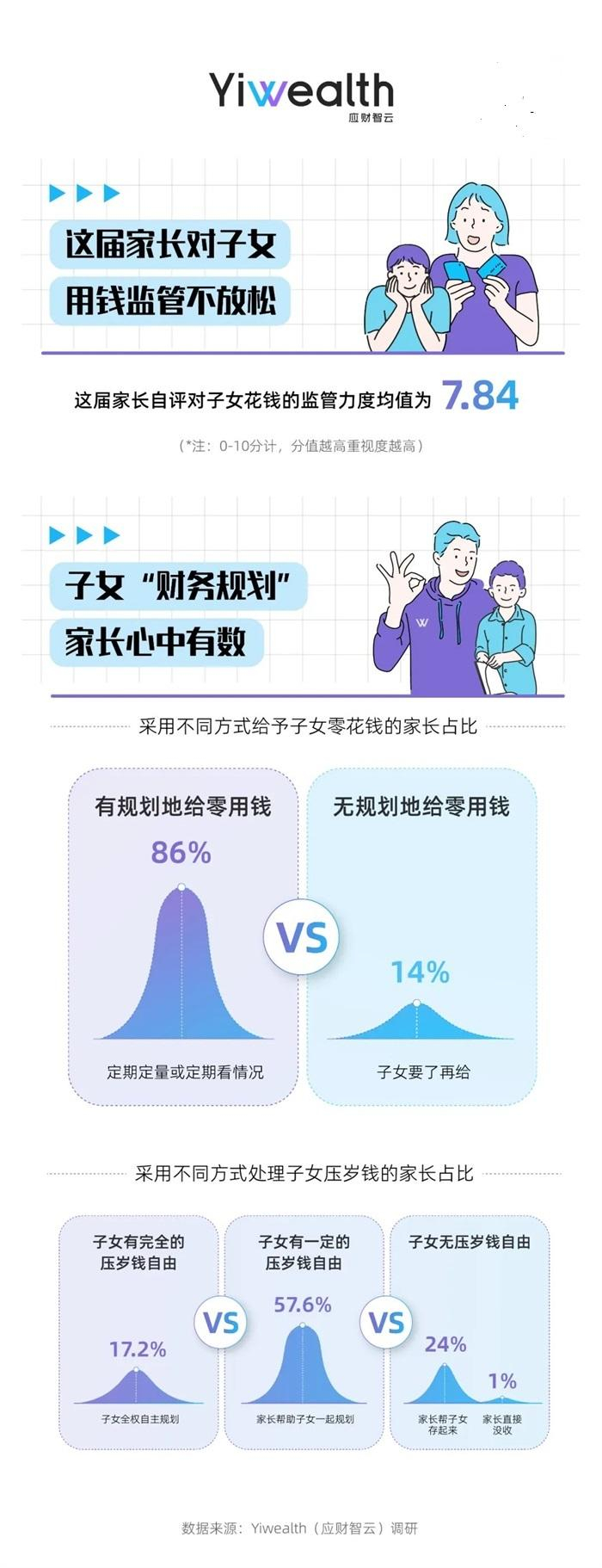 牵扯到用钱大事,这届家长对子女监管不放松,自评财务监管严格度为7.84分(满分10分)。从零用钱和压岁钱管理上来看,这届家长们“规划”有方。2018年的一份报告显示,57.8%的未成年人可定期获得零用钱。4年后,孩子们的“零用钱处境”是否发生了变化?数据显示,86%的年轻家长会固定时间给子女发放零用钱。这意味着,越来越多的家长开始意识到子女拥有零用钱自主规划权的重要性。