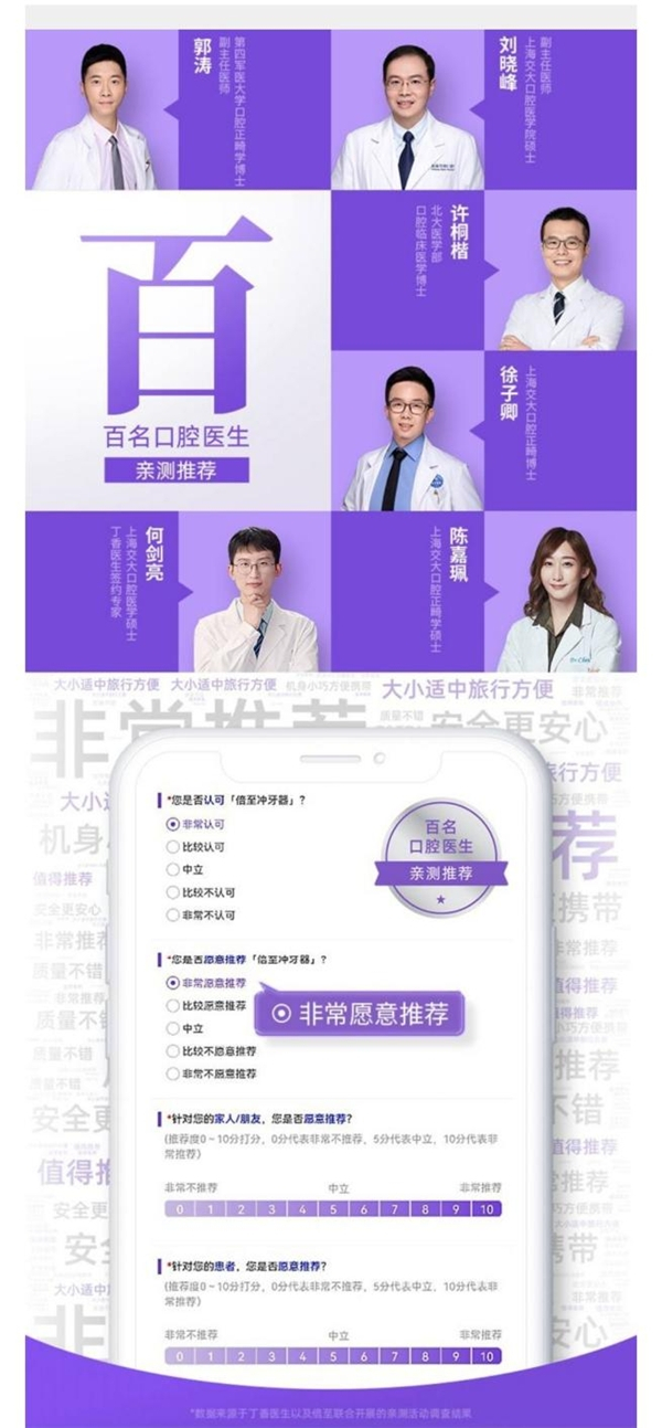 据悉,第四军医大学口腔正畸学博士、副主任医生郭涛;上海交大口腔医学院硕士、副主任医师刘晓峰;北大医学部口腔临床医学博士许桐楷;上海交大口腔正畸博士徐子卿;上海交大口腔正畸学硕士陈嘉佩;上海交大口腔医学硕士、丁香医生签约专家何剑亮等数百位口腔专家表示非常认可倍至冲牙器产品,且非常愿意推荐倍至冲牙器给家人、朋友。