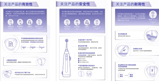泰康拜博口腔牙周专委会主任委员刘晓峰主任,上海天智口腔门诊部院长武金峰博士,卓正医疗齿科刘曦博士,中国家用电器研究院检测所岳京松副总工程师表示,首先要关注产品的有效性,因为冲牙器作为口腔健康护理工具,对口腔情况的改善是重要的考量标准,消费者首先看产品 “是否具备权威的临床功效验证支持”,这是判断产品是否有效的金标准,也是消费者比较简单可以了解产品有效性的方式。同时消费者也可以从技术指标的水流聚焦度与水流冲击力这两大方面判断产品的有效性。