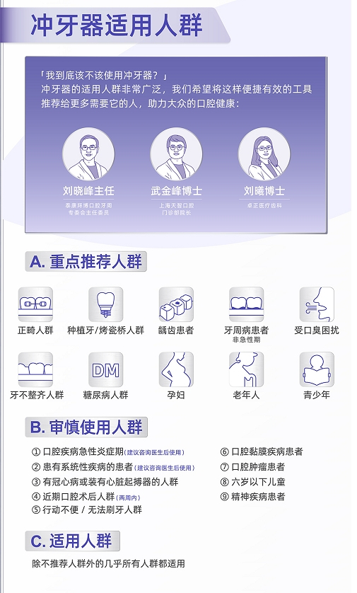 专家建议消费者在挑选冲牙器产品时首先要考虑“我到底该不该使用冲牙器”这个问题,泰康拜博口腔牙周专委会主任委员刘晓峰主任,上海天智口腔门诊部院长武金峰博士,卓正医疗齿科刘曦博士表示,冲牙器是一个适用人群很广的产品,除了小部分需要在医生建议下审慎使用的人群外,几乎所有人群都适用。重点推荐正畸人群、龋齿患者、牙周病患者等10大人群使用,口腔疾病急性炎症期、患有系统性疾病患者等9类人群需要在医生的指导建议下审慎使用。
