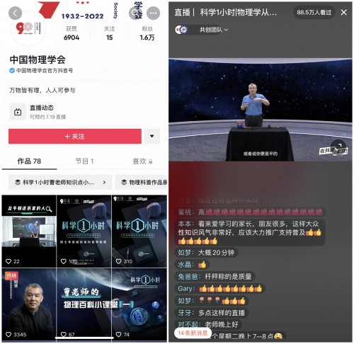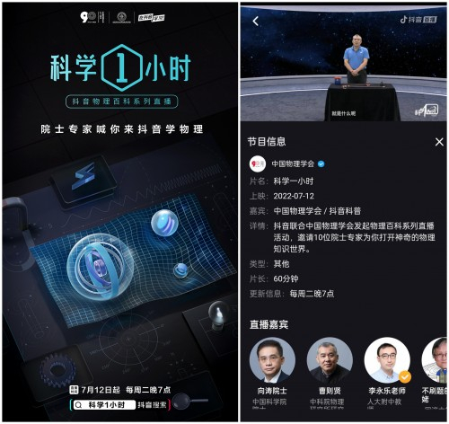 据悉,“科学1小时”是由抖音联合中国物理学会、北京师范大学科学教育研究院独家推出的科普课程。该系列直播从7月12日开始,每周二7点在“中国物理学会”官方抖音账号播出,为期两个月。除曹则贤外,还有中国科学院院士向涛、中科院物理所研究员魏红祥等10位物理学学者将参与课程直播,围绕物理模型与范式演变、牛顿力学等知识点展开讲解。