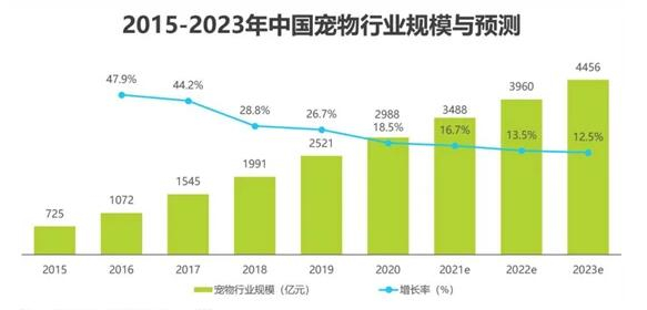 中国已有近千年的养宠历史,但宠物行业步入高速发展阶段也不过是近十年的事情。2021年《中国宠物行业白皮书》数据显示,全国城镇宠物狗和宠物猫总数超过1.12亿只,宠物主高达6844万人,消费市场规模则从2020年的2965亿元提升至2021年的3488亿元,增长20.6%,增速高于全球的6.4%。