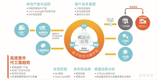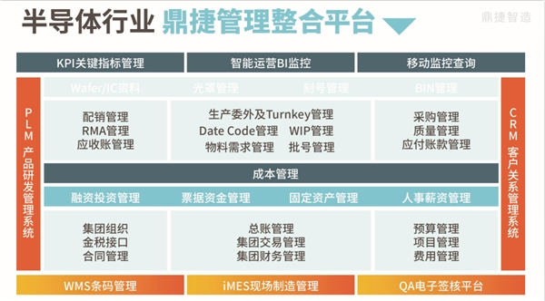 鼎捷软件半导体行业管理整合平台透过电子信息沟通平台,让合作厂商能实时分享产能、生产、库存状况,缩短制造周期时间,更精准进行需求预测;强化内、外伙伴协同合作,减少生产延迟、零件短缺、库存过高及产品质量的管理风险。