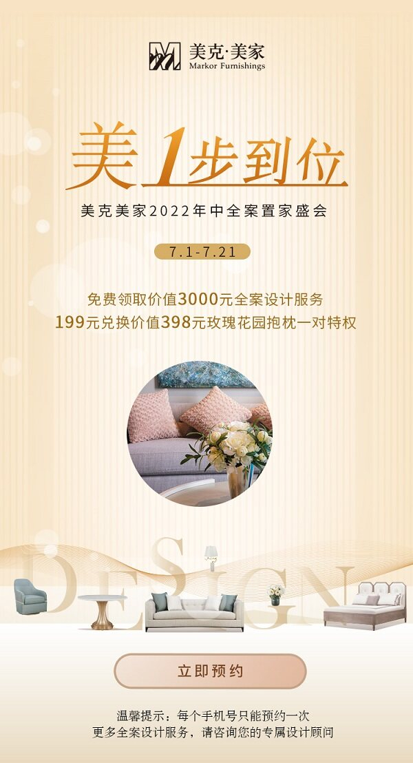 2022年,为提高消费者居住体验感和幸福感,为满足消费者对高品味、经典、浪漫、优雅的追求,美克美家特地推出2022年中全案置家活动,7月1日到8月15日活动期间,线下门店及各渠道将为消费者推出推广全案设计服务卡,为您搭建专属的全案置家攻略,美克美家心选商城小程序在线预约报名后,凭卡可享受美克美家资深设计师团队的全案服务。前1000名预约顾客,凭卡还可到店领取玫瑰花园毛绒抱枕1对。除此之外,还有超多福利等你来拿!全案不等于全屋定制,全案设计更能对家居空间高效利用、充分体现消费者的个性化消费需要、现代感强、更环保等优势,帮助消费者设计一步到位的家。