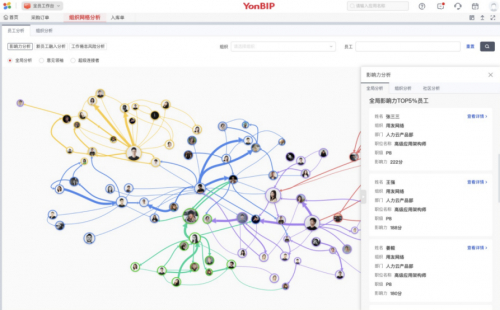 由于现代团队工作中常有跨职能、跨部门协作的场景,“非正式组织”发挥的作用越来越大,而通过ONA组织网络分析来挖掘高影响力人才,提升“非正式组织”生产力、沟通力,能够为组织带来一系列的价值。用友人力云基于云端数据(相关数据来源于用友的绩效管理、项目协同、友空间社区等模块)通过结构化、可视化的方式帮助组织识别员工的网络关系、网络覆盖面与影响力,发现组织中的“影响者”,精准定位关键人才。管理者只需在用友人力云“组织网络分析ONA”界面上轻松操作,便可将多个“非正式关系网络”尽收眼底。
