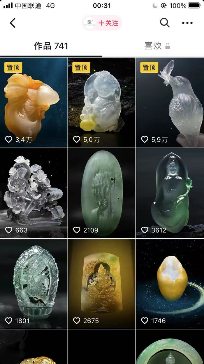 比如,账号「聚璟轩君豪工艺品」里的玉雕作品赢得大量点赞:端庄的玉佛,灵巧的金鱼,趣萌的瑞兽,展示了翡翠作品全然不同的美感,让人们看到古老东方艺术在现代灵动而新奇的一面。不过,这里诸多的作品,都是商家根据消费者的需求,结合玉石雕刻工艺定制实现。