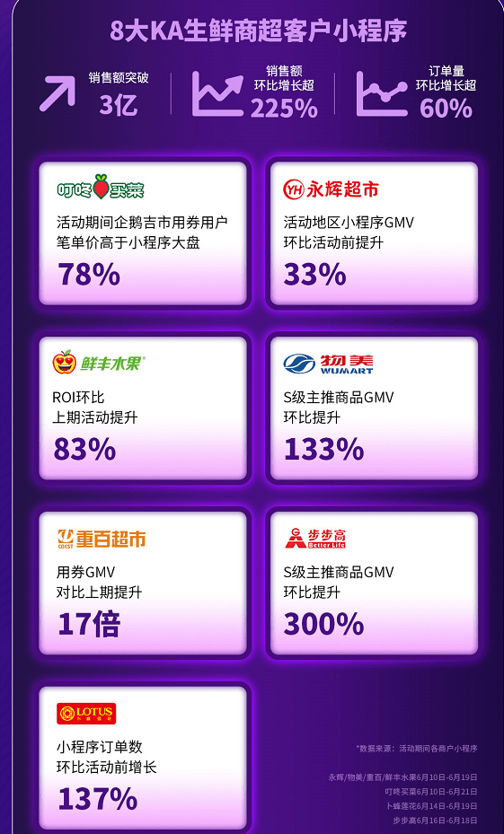 借助超级品牌日、异业发券等创新玩法,以及预约、裂变等营销工具,企鹅吉市“618商超小程序叠加节”期间,8大KA生鲜商超客户小程序累计销售额突破3亿,销售额环比增长超225%,订单量环比增长超60%。同时,全国范围内线下参与门店超过2186家,活动整体参与人次超过1452万,惠聚会场页面流量超过122万。