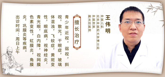 王伟明,副主任医师, 北京中研集团东城中医医院儿科专家,周日上午出诊,北京中医药大学博士后,中医世家。擅长治疗:青少年近视,弱视,斜视,散光,干眼症,玻璃体混浊,飞蚊症,黄斑变性,眼底病,视神经炎,青光眼,白内障,视网膜色素变性,虹膜炎,角膜炎,巩膜炎等疾病。
