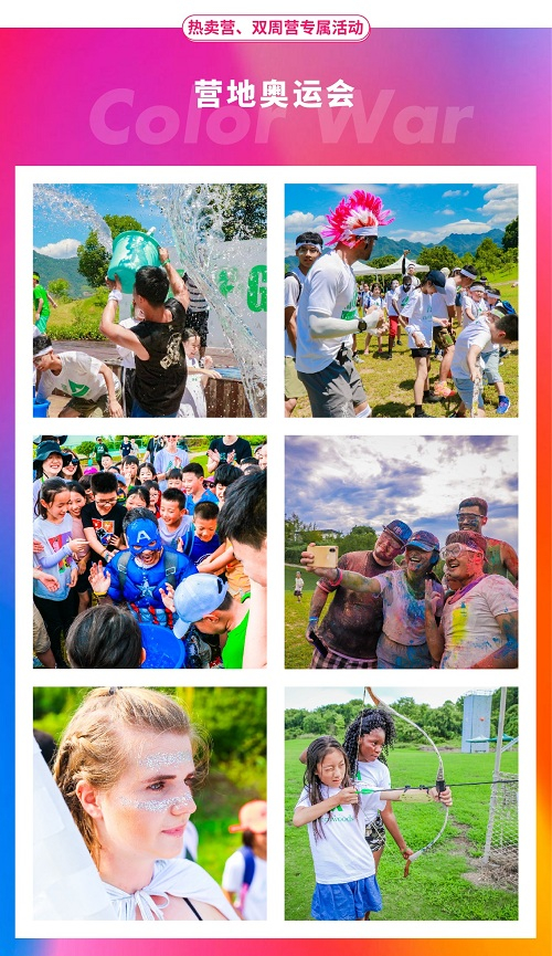 在特别设置的营地嘉年华——双周营中,为营员们专门打造的营地奥运会是夏令营中最重要的活动,它不仅仅代表着技巧的比拼、热情的挥洒、团队的荣誉、它也代表着精神的蜕变与友谊的升华,而在这之后孩子们会忽然发现整个营地所有的人都可以是与自己并肩作战的盟友,孩子们的关系也将更近一层。