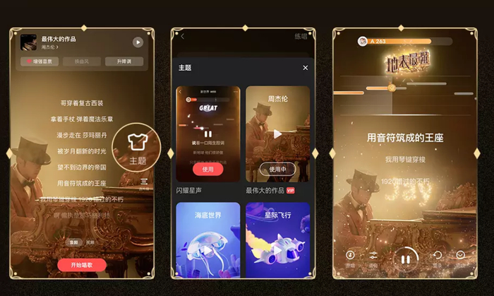 此外,新专上线后,所有会员用户还可在录唱时选择《最伟大的作品》专属皮肤,不仅有周董弹着钢琴作为录唱背景,在你唱出perfect(完美)、great(很棒)时,还会弹出“杰”式鼓励“哎呦不错哦”“地表最强”,带你解锁最有排面的录唱体验。