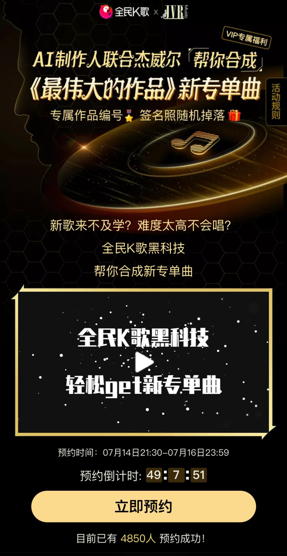 诚意十足的VIP会员福利是本次主题活动的一大亮点。在全民K歌联合杰威尔发起的活动中,依托于全民K歌的录唱黑科技,会员用户只要在全民K歌演唱并发表过5首中文歌,AI经过深度学习后就会生成一套声音模型,杰伦新专单曲不用学就会唱,帮你成为最快翻唱《最伟大的作品》全专的“杰迷”。参与活动还将获得杰威尔认证的专属作品编号,并有机会抽中周杰伦签名照等好礼。