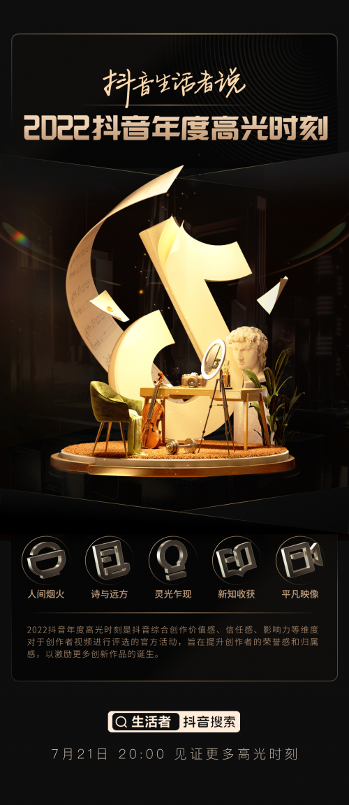 据介绍,抖音2022年度百大高光时刻名单共分五大主题,分别为人间烟火、诗与远方、灵光乍现、新知收获、平凡映像,代表了不同的内容创作方向。所有作品根据“创作价值感”“创作信任感”“创作影响力”等标准评出,要求作品具备专业性、大众认可、鼓舞人心等。