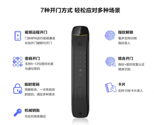 在便捷功能上,乐橙视频锁V7一触即可开门,支持指纹、密码、指纹+密码组合开门、卡片、手机APP远程开门、临时密码和机械钥匙解锁等七种解锁方式,另有变声对讲、出入提醒、临时密码等功能,真正从用户出发,为家居生活提供切实便利。