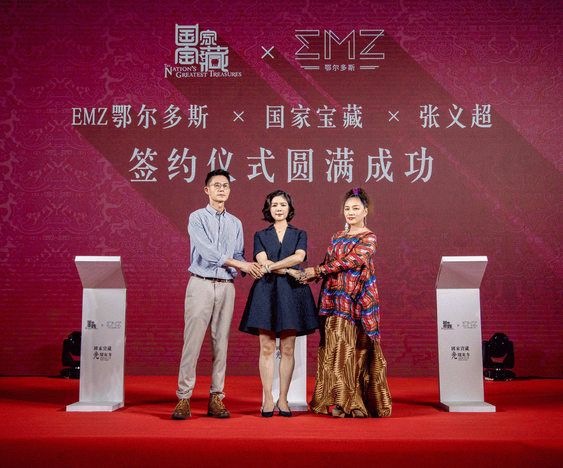 2021年,EMZ鄂尔多斯正式与央视国家宝藏IP授权方物喜堂、著名服装设计师张义超举行三方签约开启联名合作,并通过联名款发布/全国购物中心巡展等一系列跨界营销活动,启动品牌文化跨界和东方美学艺术之旅。